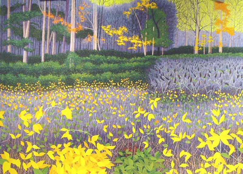 Gordon Mortensen (b. 1938, American) is one of the best known reduction woodcut print artists working in the U.S today. He works from watercolor studies to understand the color dynamics needed for the woodcut. The artist uses up to sixty-four colors and takes as long as three months to create the woodblock image. Although the final outcome has a painterly feel, it is unmistakably a woodcut with rich layered colors and wood grain textures. His early images mostly represent the upper Midwest landscape, and areas around where he lived in North Dakota. His color preferences in these early works is more muted compared to the brighter colors he favors to present his current home in California.