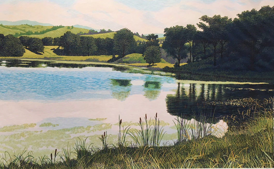Gordon Mortensen (b. 1938, American) is one of the best known reduction woodcut print artists working in the U.S today. He works from watercolor studies to understand the color dynamics needed for the woodcut. The artist uses up to sixty-four colors and takes as long as three months to create the woodblock image. Although the final outcome has a painterly feel, it is unmistakably a woodcut with rich layered colors and wood grain textures. His early images mostly represent the upper Midwest landscape, and areas around where he lived in North Dakota. His color preferences in these early works is more muted compared to the brighter colors he favors to present his current home in California.