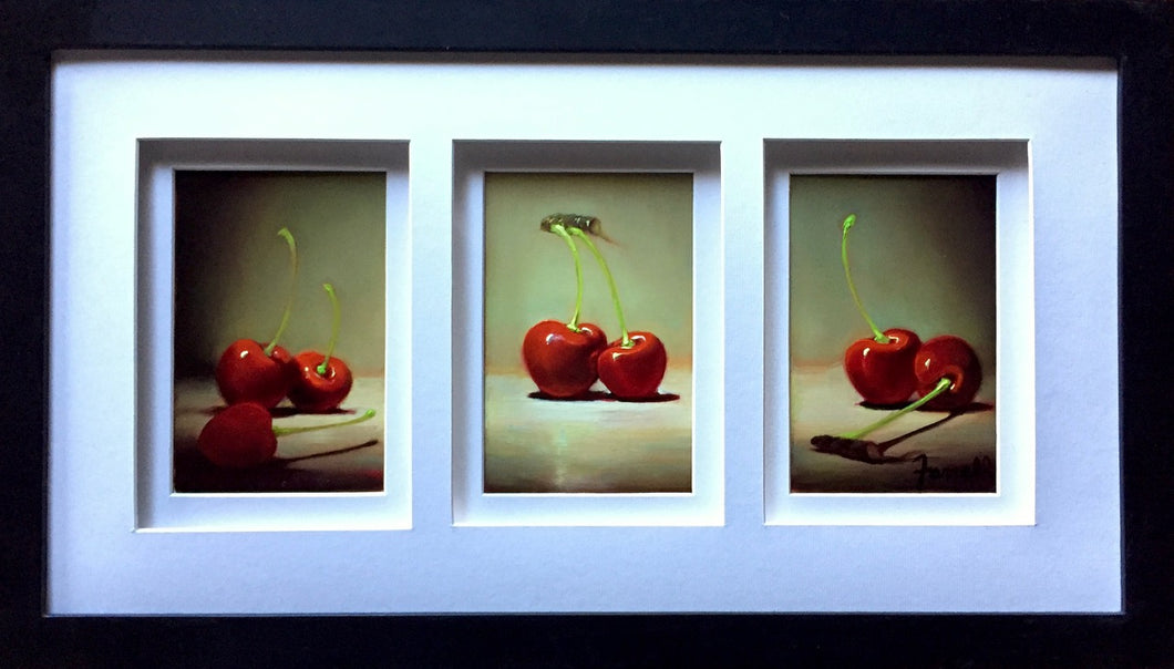 "Cherries & Light Study" (Triptych) by Sean Farrell - Vibrant Still Life Oil Painting