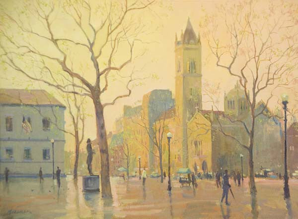 "Copley in Spring, Boston" by Leonard Mizerek - Impressionist City Life Oil Painting