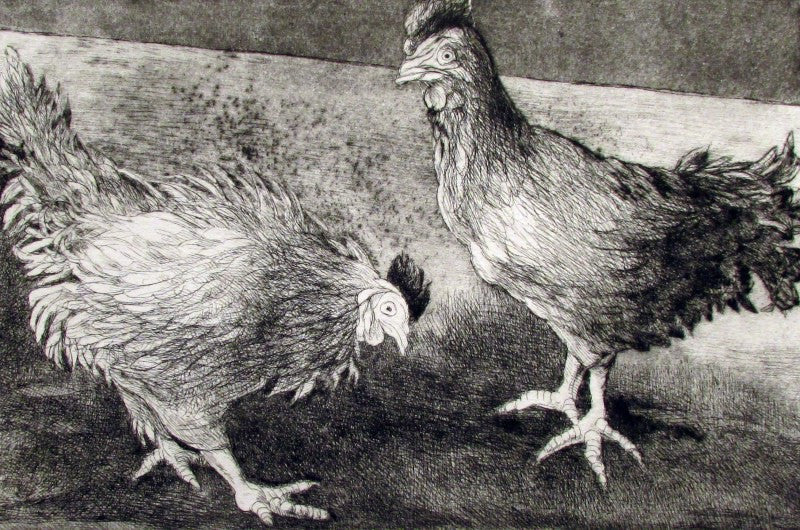 "Hens" by Anne Lyman Powers - Black and White Animals Etching on Paper