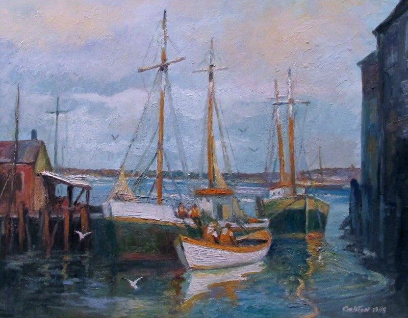Tom Carleton was born in Cambridge, MA in 1925 and was a veteran of World War II.  He graduated from the Scott Carbee School of Fine Arts in Boston in 1950, where he received a classical training degree.  His impressionistic paintings document old and new marine subjects as well as landscapes and seascapes, particularly of the North Shore.