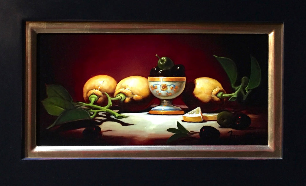 "Italian Olives and Lemons" by Sean Farrell - Vibrant Still Life Oil Painting