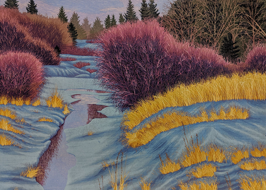 Gordon Mortensen (b. 1938, American) is one of the best known reduction woodcut print artists working in the U.S today. He works from watercolor studies to understand the color dynamics needed for the woodcut. The artist uses up to sixty-four colors and takes as long as three months to create the woodblock image. Although the final outcome has a painterly feel, it is unmistakably a woodcut with rich layered colors and wood grain textures. His early images mostly represent the upper Midwest landscape, and areas around where he lived in North Dakota. His color preferences in these early works is more muted compared to the brighter colors he favors to present his current home in California.