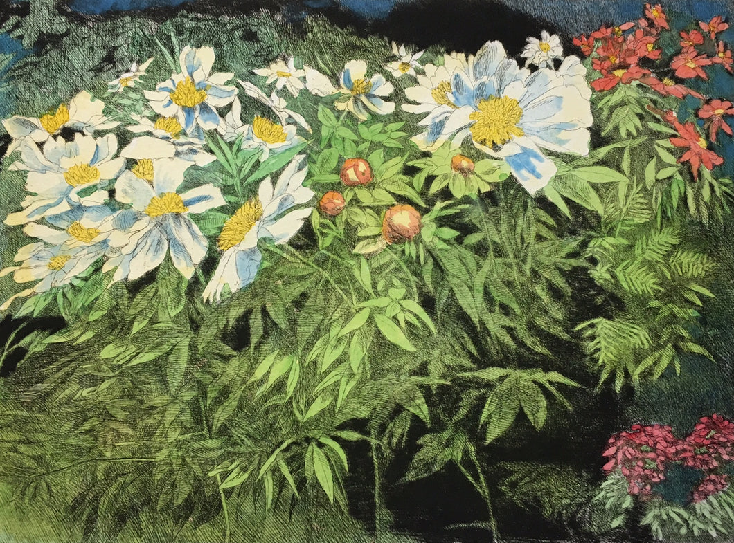 "White Peonies" by Anne Lyman Powers - Hand-colored Floral Etching on Paper