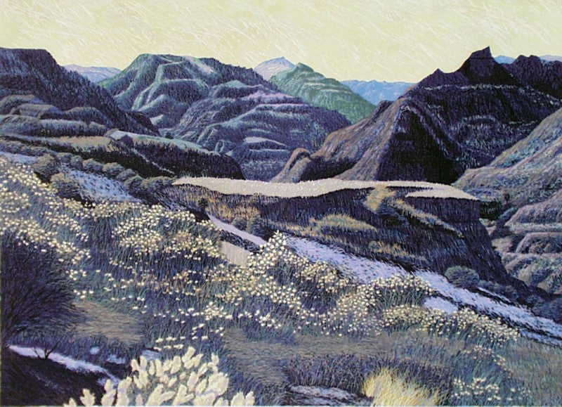 Gordon Mortensen (b. 1938, American) is one of the best known reduction woodcut print artists working in the U.S today. He works from watercolor studies to understand the color dynamics needed for the woodcut. The artist uses up to sixty-four colors and takes as long as three months to create the woodblock image. Although the final outcome has a painterly feel, it is unmistakably a woodcut with rich layered colors and wood grain textures. His early images mostly represent the upper Midwest landscape, and areas around where he lived in North Dakota. His color preferences in these early works is more muted compared to the brighter colors he favors to present his current home in California.
