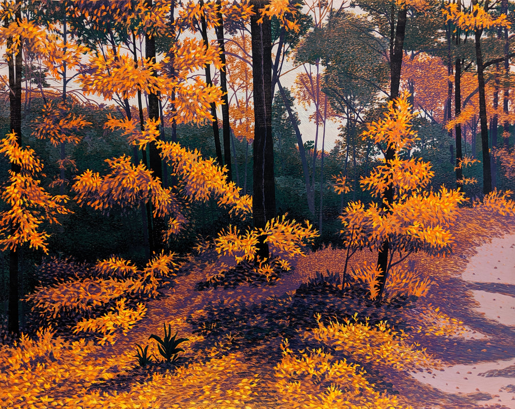 Gordon Mortensen (b. 1938, American) is one of the best known reduction woodcut print artists working in the U.S today. He works from watercolor studies to understand the color dynamics needed for the woodcut. The artist uses up to sixty-four colors and takes as long as three months to create the woodblock image. Although the final outcome has a painterly feel, it is unmistakably a woodcut with rich layered colors and wood grain textures. His early images mostly represent the upper Midwest landscape, and areas around where he lived in North Dakota. His color preferences in these early works is more muted compared to the brighter colors he favors to present his current home in California.