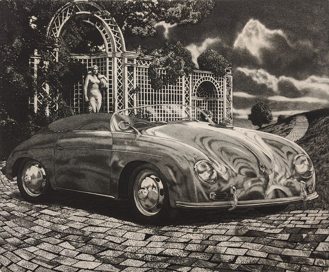 "Speed" by David Bumbeck - Classic Automobile Black and White Etching