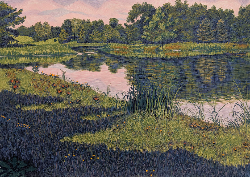 Gordon Mortensen (b. 1938, American) is one of the best known reduction woodcut print artists working in the U.S today. He works from watercolor studies to understand the color dynamics needed for the woodcut. The artist uses up to sixty-four colors and takes as long as three months to create the woodblock image. Although the final outcome has a painterly feel, it is unmistakably a woodcut with rich layered colors and wood grain textures. His early images mostly represent the upper Midwest landscape, and areas around where he lived in North Dakota. His color preferences in these early works is more muted compared to the brighter colors he favors to present his current home in California.