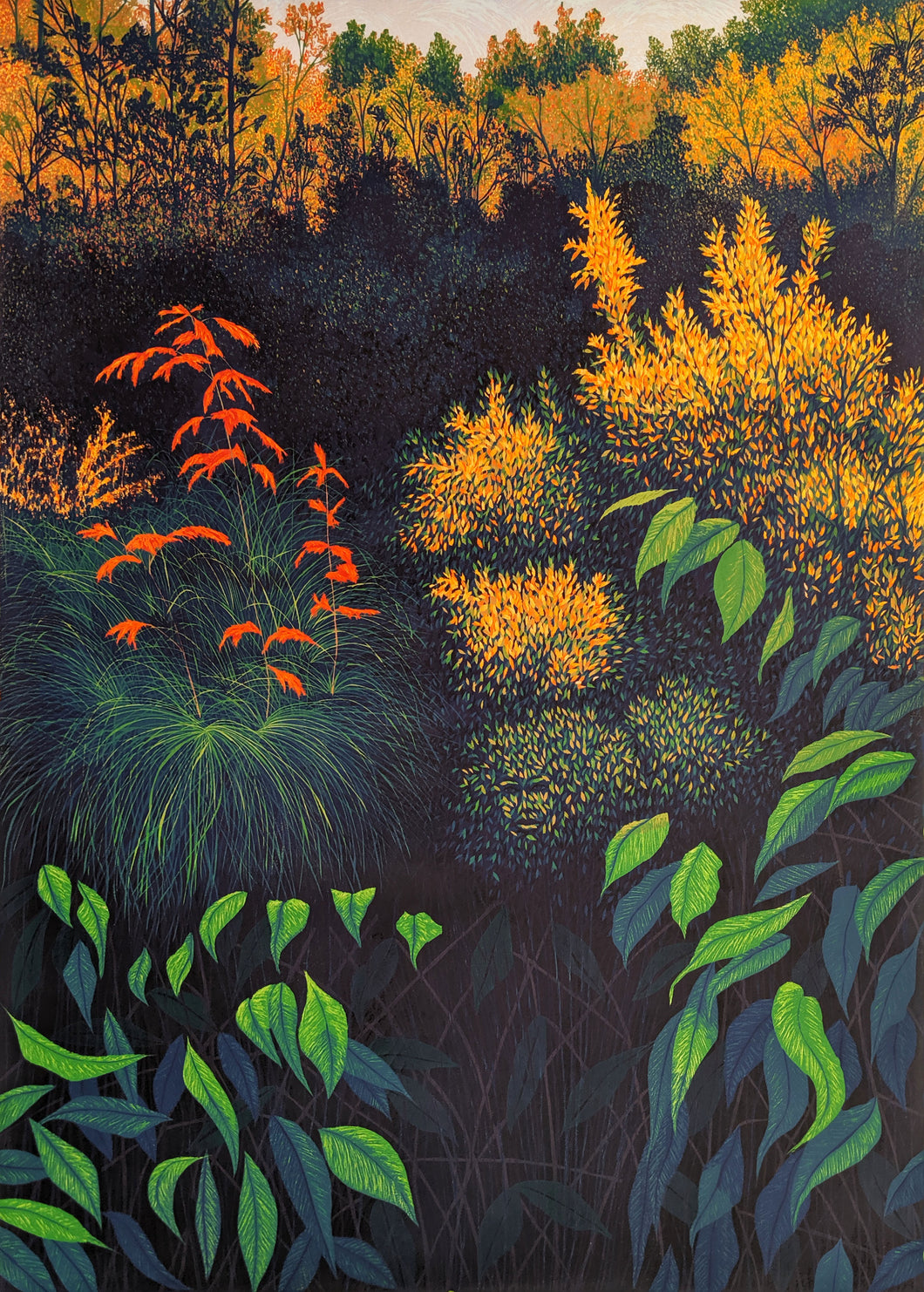 Gordon Mortensen (b. 1938, American) is one of the best known reduction woodcut print artists working in the U.S today. He works from watercolor studies to understand the color dynamics needed for the woodcut. The artist uses up to sixty-four colors and takes as long as three months to create the woodblock image. Although the final outcome has a painterly feel, it is unmistakably a woodcut with rich layered colors and wood grain textures. His early images mostly represent the upper Midwest landscape, and areas around where he lived in North Dakota. His color preferences in these early works is more muted compared to the brighter colors he favors to present his current home in California.