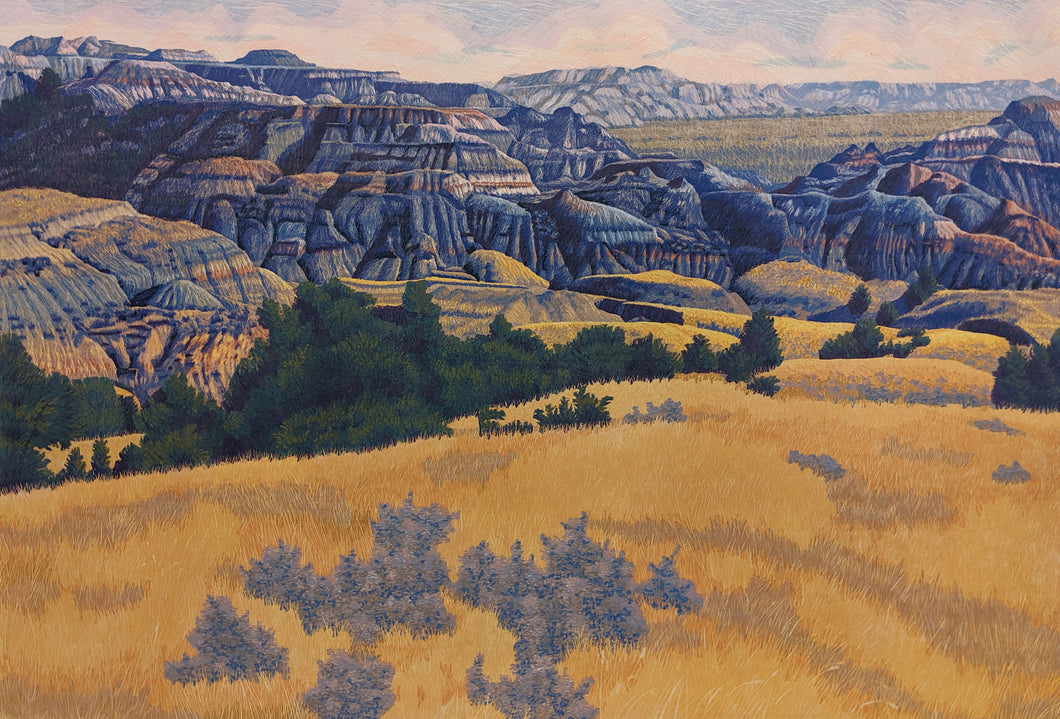 Gordon Mortensen (b. 1938, American) is one of the best known reduction woodcut print artists working in the U.S today. He works from watercolor studies to understand the color dynamics needed for the woodcut. The artist uses up to sixty-four colors and takes as long as three months to create the woodblock image. Although the final outcome has a painterly feel, it is unmistakably a woodcut with rich layered colors and wood grain textures. His early images mostly represent the upper Midwest landscape, and areas around where he lived in North Dakota. His color preferences in these early works is more muted compared to the brighter colors he favors to present his current home in California.