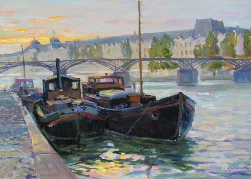 "Barges Near the Louvre" by Leonard Mizerek - Impressionist Paris Seine Oil Painting